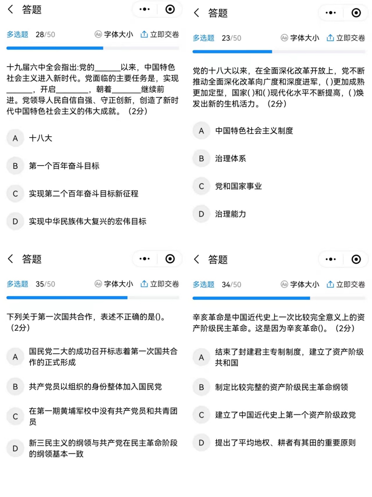 竞赛采用线上答题模式,内容涵盖十九届六中全会和2022年全国两会精神,以及党的初心使命、光辉历程、伟大精神、宝贵经验、创新理论等。比赛题型包括单选、多选和判断,限时25分钟之内完成。通过系统随机抽题,保证公平公正公开,学院以参赛者的答题成绩、答题用时作为评奖依据,最终评选出优秀参赛个人和支部(班级)。本次学习知识竞赛检验了学院党的理论学习教育的阶段性成效,以赛促学,以学促知,调动了学院学生的学习积极性,推动了党史学习教育走深走实。