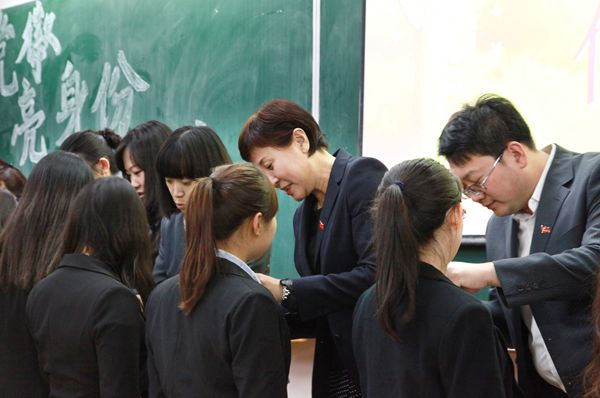 首先主持人景然同学为我们介绍了党徽以及佩戴党徽的党员们的义务,接下来由老师们为我们的全体学生党员佩戴党徽,在这神圣又庄严的一刻,所有的同学们对党徽充满了无限的敬意。