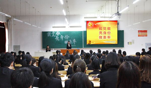 2016年3月25日,会计学院学生党员活动站组织了一次以“戴党徽,亮身份,做表率”为主题的会计学院学生党员学习大会。到场的人员有会计学院党总支书记陈慧华教授、副书记刘天教授、团委书记王博老师、团委副书记郑磊老师、2013级辅导员李慧铭老师、韩雪老师、2014级辅导员奚迪老师、2015级辅导员白璐老师以及会计学院全体学生党员。