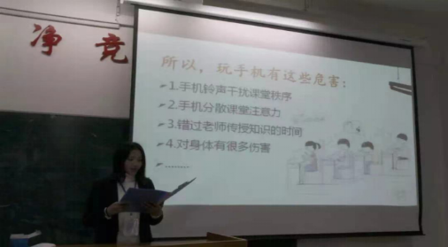 讲座的最后,纪检部干事们呼吁大学生能够抵制上课玩手机的行为,从自身做起,树立远大的人生理想,培养顽强的意志,端正良好的态度,抓住人生中最美好的时光,做好该阶段有意义的事情。