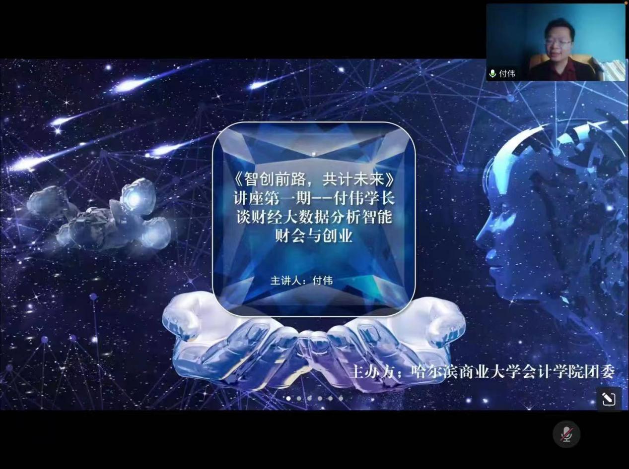 2022年11月19日下午,由会计学院校友会主办的《智创前路,共计未来》讲座第一期在腾讯线上会议平台上举行。为增强学生对财经大数据分析和智能财会的前沿学科知识的理解、明确对未来职业的规划,校友会特邀校友付伟为我院师生开展了以”财经大数据分析智能会计与创业”为主题的讲座,付伟是2003级财务管理专业毕业生,现为跃客科技总裁,数智云科技(辽宁)有限公司执行董事,中国会计教育专家委员会委员,国家教学成果获得者教育部优秀创业导师,江西财经大学客座教授,哈尔滨商业大学、东北财经大学、东北师范大学等高校外聘研究生导师。王明炜主持会议。