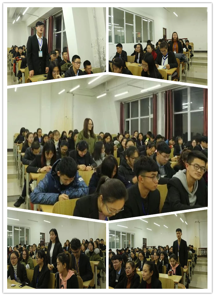 会上进行了几次简单有趣的提问环节,同学们积极踊跃回答问题,更加透彻的了解了此次活动的意义。随后主持人又向大家详细地描述了主要课程的内容,包括理论学习、实践锻炼、志愿服务、对外交流与课题研讨。
