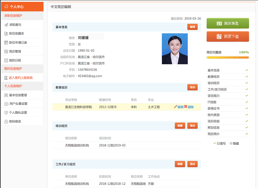 点击“编辑”按钮,进入简历详情,学生依次可对基本信息、教育经历、工作实习经历、培训经历等内容进行编辑,系统会实时监测简历完善程度(要求完整度达到80%即可投递简历)。