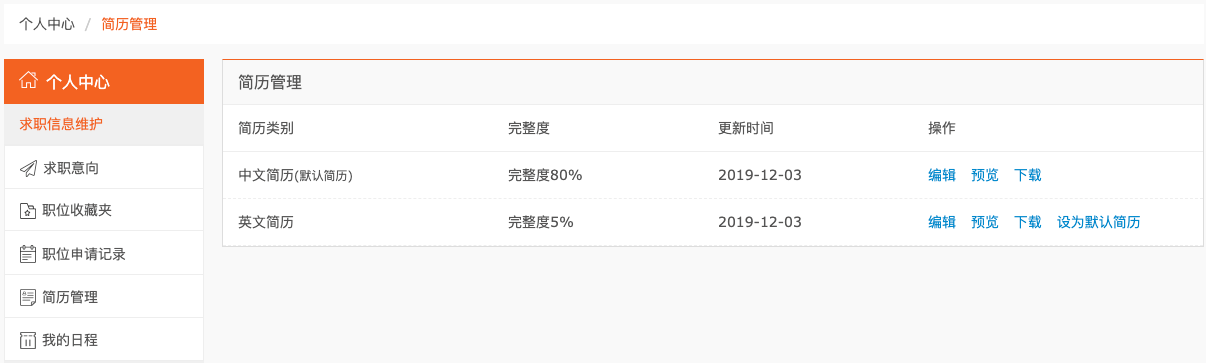 学生账号:系统默认会为学生创建2个系统内的简历,中、英文各一份,默认中文。在系统内投递出的简历皆以此为准。学生可对两份简历进行编辑、预览、下载、设为默认简历等操作。