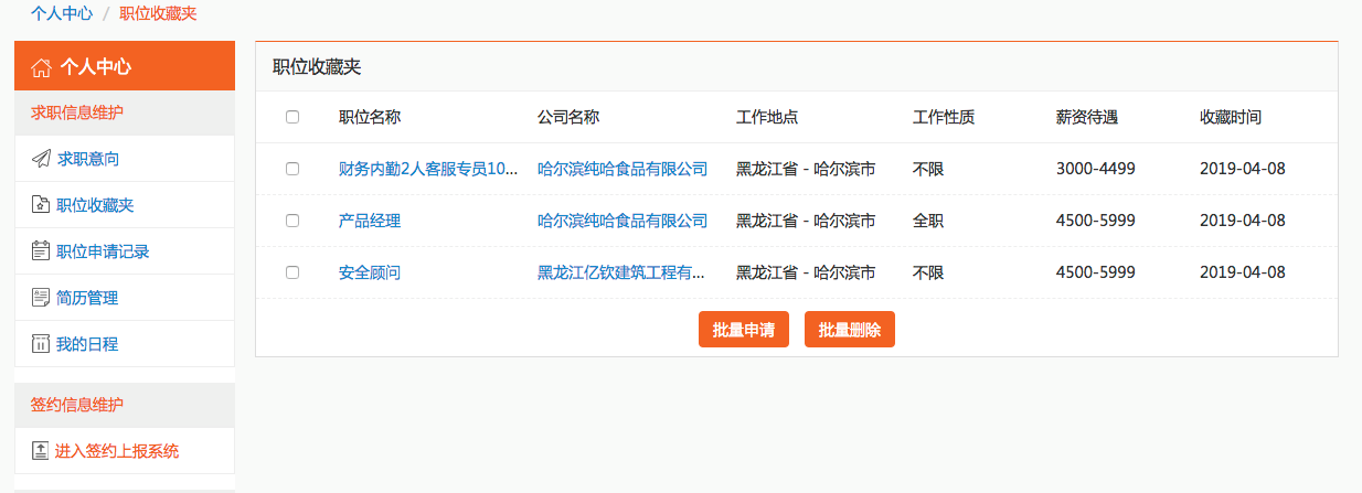 如选择收藏职位,则职位会在“职位收藏夹”模块暂存。如下图所示: