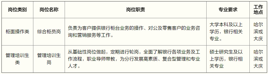 1.大学本科及以上学历,金融、会计、经济、贸易、管理等银行相关专业,其中管理培训生岗要求硕士研究生及以上学历;