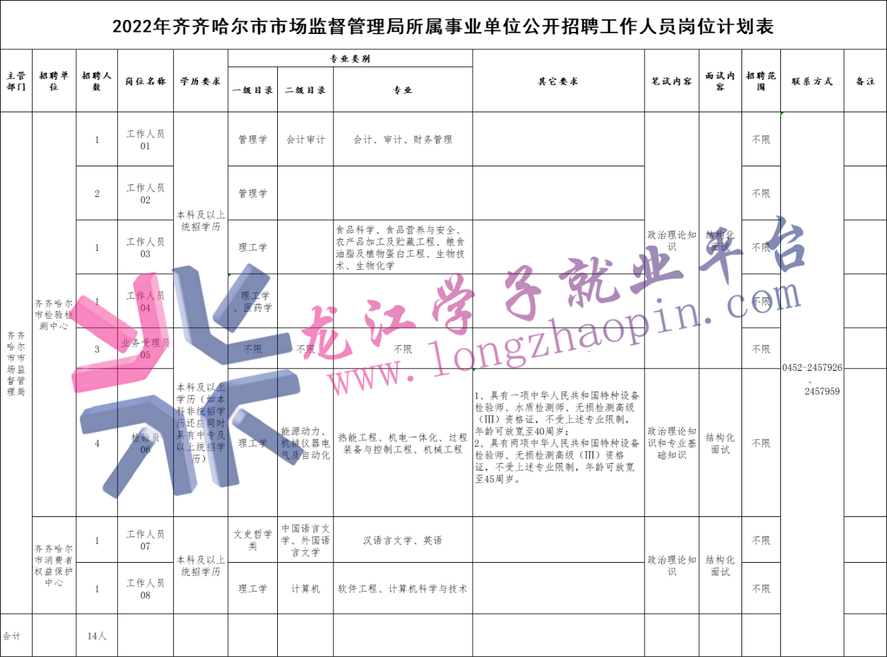 齐齐哈尔市检验检测中心本次计划招聘工作人员12名,齐齐哈尔市消费者权益保护中心本次计划招聘工作人员2名。具体岗位和要求详见《2022年齐齐哈尔市市场监督管理局所属事业单位公开招聘工作人员计划表》。