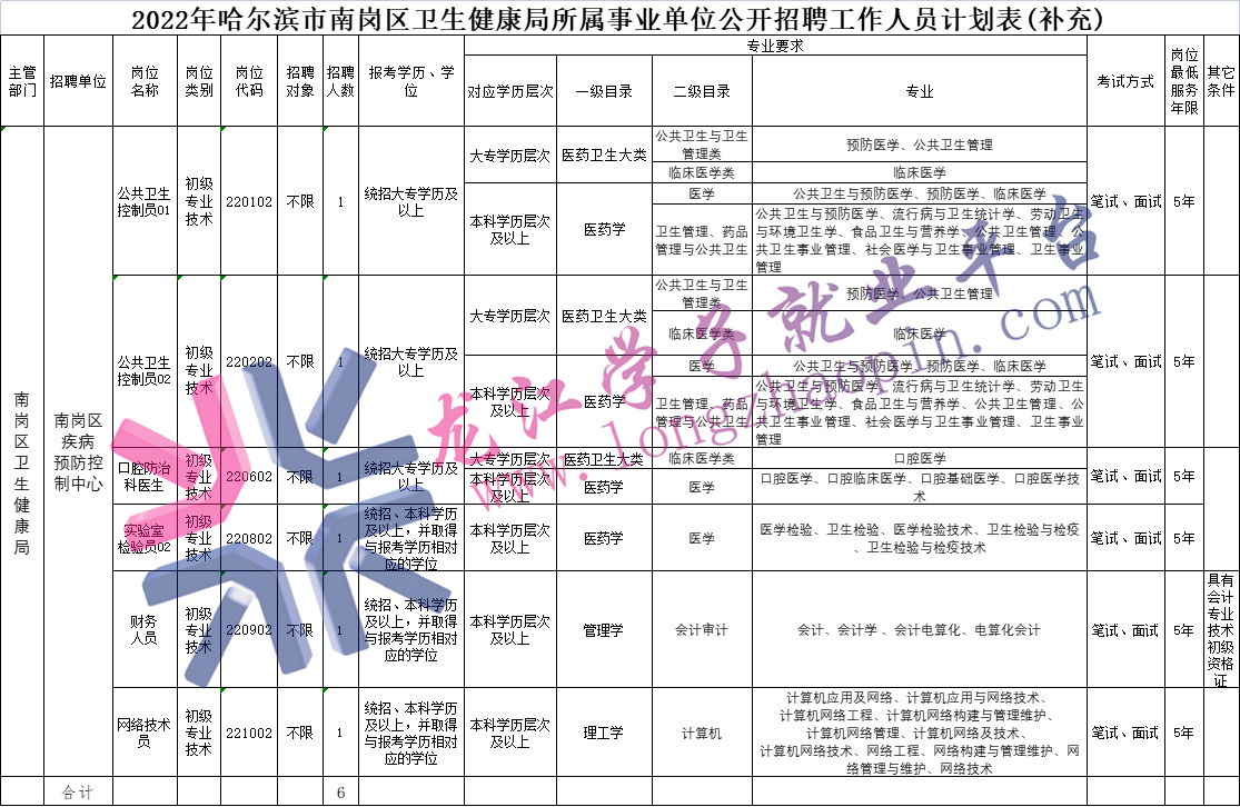 此次公开招聘事业单位工作人员6人,均为专业技术岗。具体招聘岗位、人数、条件等详见《2022年哈尔滨市南岗区卫生健康局所属事业单位公开招聘工作人员计划表(补充)》(以下简称《招聘计划表》)。