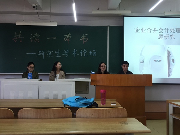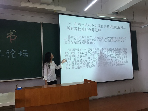 活动开始时论坛主持人首先作开场介绍,随后会计学院副院长张劲松教授发言并宣布论坛正式开始。第一小组的同学以播报形式引出主题——企业合并会计处理相关问题研究,该播报通过结合最新优步和滴滴打车合并的新闻,语言幽默,紧扣主题,形式新颖。随后,小组同学围绕该主题介绍企业合并的背景以及形式,重点阐述同一控制与非同一控制下企业合并长期股权投资与所有者权益的合并处理,并针对其中存在的因合并引起的报表粉饰问题提出了解决措施。