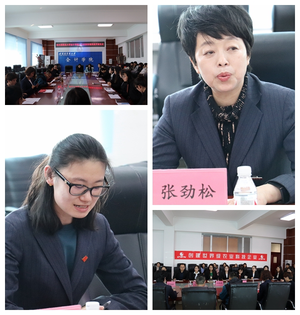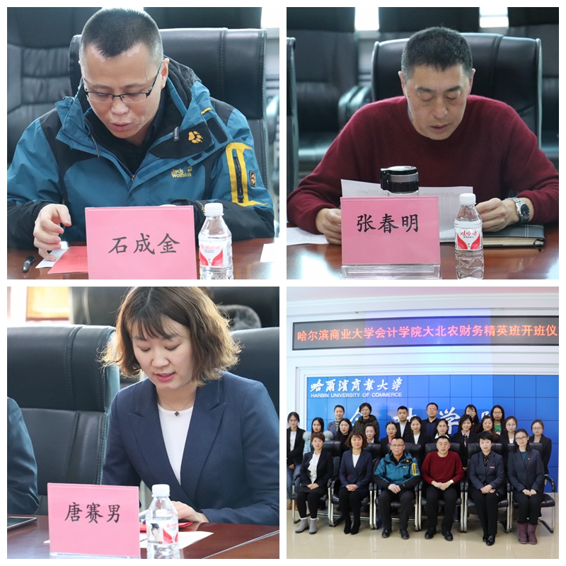 开班仪式由白璐老师主持。首先,由会计学院副院长张劲松教授致辞。张劲松院长首先表达了对大北农集团的感谢,感谢大北农集团为会计学院学生提供有助于学生未来发展的平台。张劲松院长对学员提出要求:学员要认真学习,不断努力,将所学理论知识和实践相结合,更好的发挥专业优势。最后,张劲松院长表达了对财务精英班学员的祝愿,希望每一个学员都会有所收获。接下来由黑龙江区基地经理石成金老师致辞。石成金老师表示此刻的心情既激动,又忐忑,因为回到了多年不见的母校。石老师向会计学院领导表示自己现在的成就离不开母校的培养,对母校的感激之情无以言表。石老师还向我们简短介绍了大北农集团的概况,同时也表达了对财务精英班全体学员的祝愿。其次由会计学院张春明书记宣读大北农班成员名单及班主任的任命:财务精英班校内班主任为白璐老师,校外班主任为唐赛男老师。然后由学生代表马玉冉同学发言。马玉冉同学代表全体精英班同学表达了对会计学院和大北农集团的无限感激,并坚定了日后定会和大家一起认真学习来回报会计学院和大北农集团的决心。最后,由哈尔滨商业大学会计学院大北农财务精英班开班仪式校外班主任唐赛男老师宣读《大北农班日常管理规定》,接着哈尔滨商业大学会计学院大北农财务精英班学员与校企双方嘉宾到台前合影留念,其他同学有序退场。