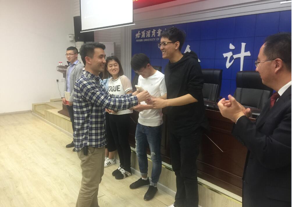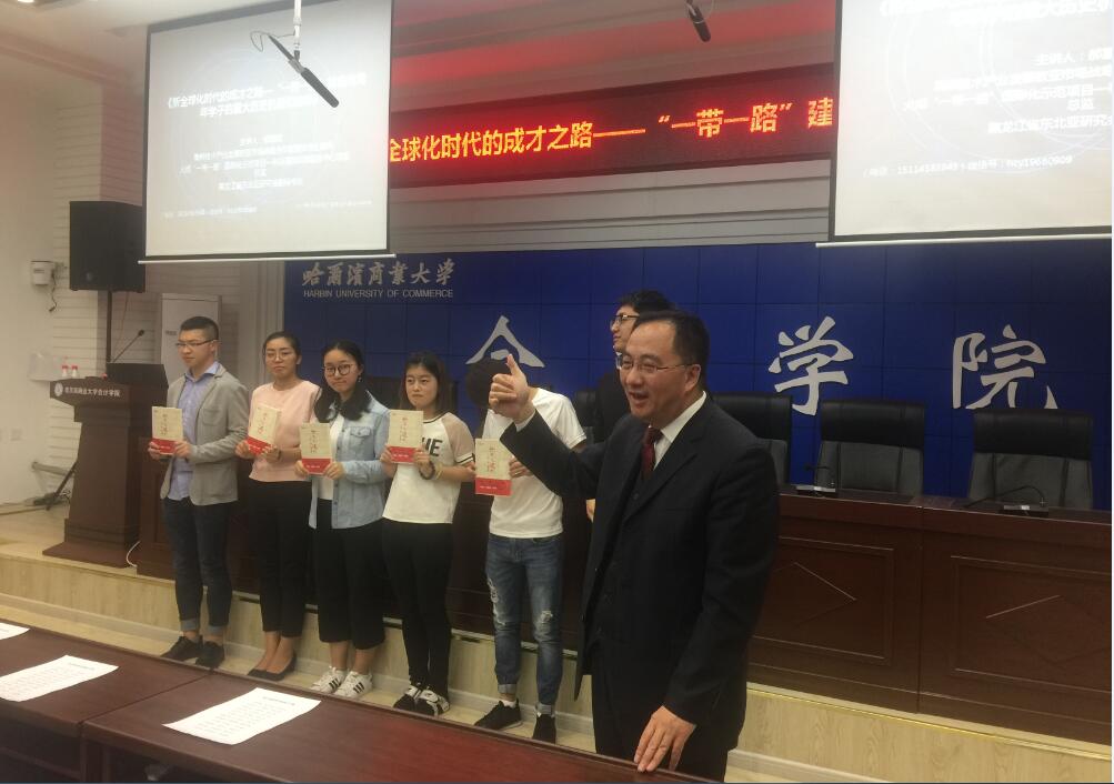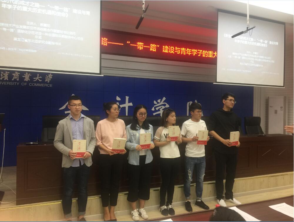 第二部分是郝老师模拟新闻发言人与现场同学进行了热烈的互动。由六名同学对“一带一路”的未来建设和东北地区的发展趋势提出了一些问题,如东北一带一路对外贸易的制约因素、中俄跨境电商的中转仓的建立、哈高新区和哈经开区这种国家级新区在“一带一路”中能获得的机遇、东北老工业基地在“一带一路”中重新振兴的可能性与前景等具体问题。郝先生深入浅出的对问题进行了解答,是同学们心中疑惑有所解答,更是一次讲座之后的更大收获。郝先生临近结束后还赠《世界是通的——一带一路的逻辑》一书给积极参与互动的同学,希望大家百尺竿头更进一步。
