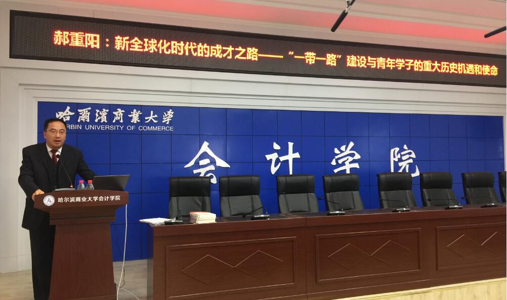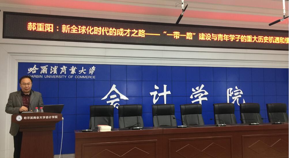 2017年5月9日晚,我院在会计学院报告厅举行了以“新全球化时代的成才之路—”一带一路”建设与青年学子的重大历史机遇和使命”为主题的培训讲座,主讲人是高新技术产业发展欧亚市场战略合作欧盟秘书处顾问、火炬“一带一路”国际化示范项目-科谷国际采购服务中心项目总监、黑龙江省东北亚研究会副秘书长郝重阳先生。会前,会计学院院长、博士生导师,张林教授对郝重阳先生做了介绍,并表示郝重阳先生在“一带一路” 问题上有着深刻的研究和见地,希望大家从今天的讲座中受益。
