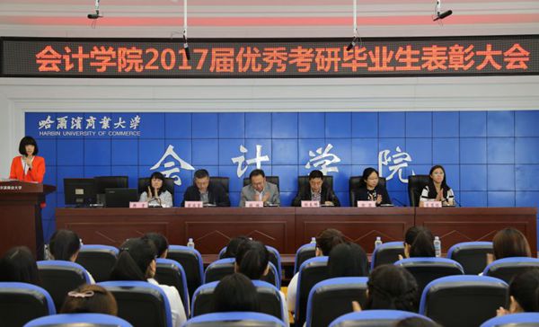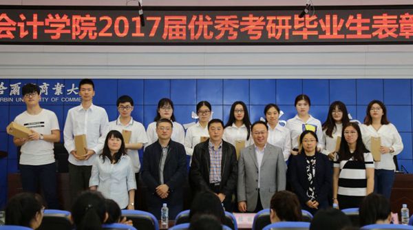 张春明书记首先致辞表达了对考生的真诚祝贺,他指出今年会计学院的考研人数再创学院历史新高,感谢同学们对商大、对会计学院做出的贡献,希望同学们能够坚持人性的善良、坚守道德的底线,母校的大门永远为他们敞开,永远为他们感到骄傲自豪!随后,会计学院献给毕业生的礼物——视频《那些年》的播放,引起了同学们的共鸣,这份礼物记录着同学们那段埋头苦读的日子、那段激情四射的时光。一幕幕的场景就像一张张绚烂的剪贴画,串连成一部即将谢幕的电影,播放着他们的快乐和忧伤,记录着他们的青春和成长。大会第三项,副院长徐鹿、梁运吉老师宣读了国内外考研毕业生名单,共计181名同学,考研比率达18.8%。院领导和老师亲手为181名同学颁发了精美的纪念品,表达了会计学院对大家炙热的情怀和永不变温的关爱。之后,优秀学生代表周敬、张晟奇同学在表彰会上发表感言,他们表示感谢学院、老师们给予的莫大帮助和支持,正因如此他们才走得更高、更远,他们一定不忘初心、砥砺前行。