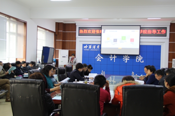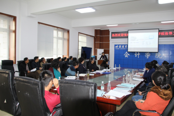 科研处刘晓峰处长高度评价了会计学院过去几年取得的科研成果,提出完善会计平台建设、基地建设的指导性建议;邢宗新副处长针对哈商大科研获奖申报环节存在的问题和科研课题立项情况进行汇报,并提出希望“十三五”期间会计学院多出各项优秀科研成果。景侠副处长汇报了哈商大关于国家级平台等项目的建设情况,提出了会计学院在举办学术交流、学术活动、平台建设等方面建议,希望会计学院建立高水平的学术平台和基地,并成立省级学会。
