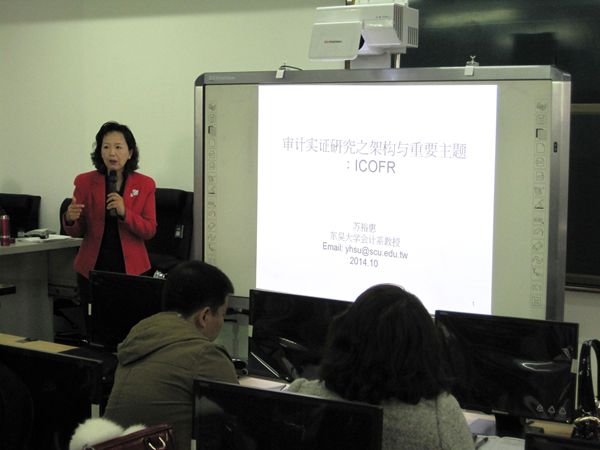 2014年10月12日,东吴大学会计系主任、台湾大学商学博士、CPA、CIA,中华会计教育学会秘书长、美国耶鲁大学商学院专任访问学人苏裕惠教授应邀在哈尔滨商业大学会计学院做了题为“审计实证研究之架构与重要主题”与“全球审计准则与审计观念的新发展”的学术讲座。会计学院科研副院长院长张劲松教授主持了此次会议,审计教研室主任李兆华教授等部分教师、黑龙江省会计领军人才、会计学院硕士研究生参加了此次学术交流会。