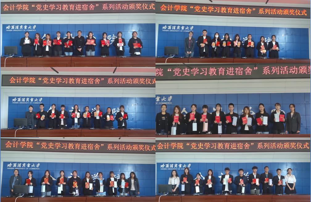 5月26日,会计学院在1501报告厅举行“党史学习教育进宿舍”系列活动颁奖仪式,出席大会的有会计学院党委书记张春明,团委书记白璐,团委副书记韩雪、奚迪,2017级辅导员李慧铭,2018级辅导员陆黎敏,2020级辅导员张涵,姜译涵,研究生辅导员李修茹。张春明书记在颁奖仪式上讲话,充分肯定了此次活动的意义,鼓舞了学生们学习党史的热情,激励学生们认真学习科学文化知识,将来投入到社会主义现代化建设中去。“党史学习教育进宿舍”系列活动以“宿舍党史故事会”、“百首红歌进宿舍”、“描绘百年党史”为主题,近百个宿舍参赛,比赛分为初赛、决赛以及网络投票三个环节,最终评选出一等奖、二等奖、三等奖和最具人气奖。此次活动充分展示了学生才艺,促进室友之间的感情,将党史学习教育融入宿舍,点燃学生党史学习热情,切实感悟党的初心使命,走好青年一代新长征路。