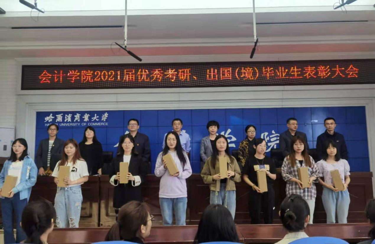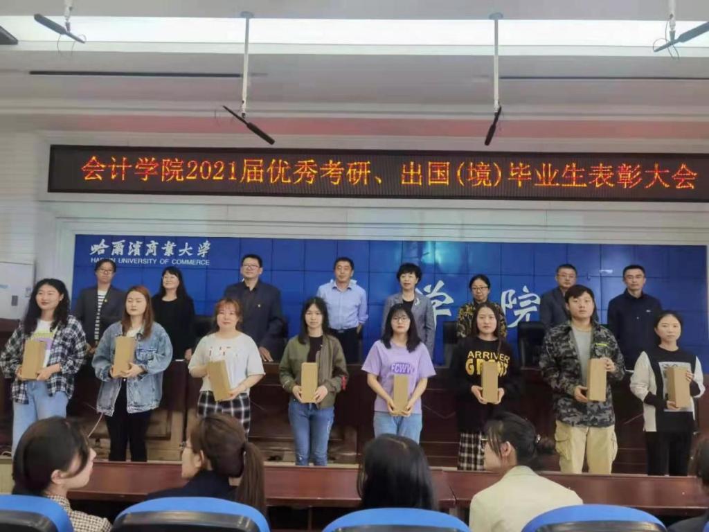 大会由党委副书记王博老师主持。大会第一项,院长张劲松老师代表学院向2021届优秀升学毕业生表示祝贺,同时对同学们提出了殷切期望。张院长强调:“国无德不兴,人无德不立,作为当代青年要胸怀祖国,做一个心有大爱的追梦人,把人生同民族的命运紧密联系在一起,把爱国情、强国志、报国行自觉融入到建设社会主义现代化强国,实现在中华民族伟大复兴的奋斗之中;要志存高远,做一个信念坚定的追梦人,要笃实力行,做一个脚踏实地的追梦人。”大会第二项,由副院长徐鹿老师,副院长梁运吉老师,副院长姜雪松老师宣读国内外考研毕业生名单。大会第三项,学生代表徐湖仪在表彰大会上代表优秀毕业生发言。她感谢学院和老师们给予的莫大帮助和支持,感恩母校的培育之恩和同窗好友的互助之情,在今后的学习、生活中会自觉将个人理想追求融入到国家和民族的事业中,坚定方向,砥砺前行。毕业后一定不忘母校培养,为母校争光。大会第四项,全体获奖学生上台颁奖。学院为同学们准备了精美的纪念品,承载着会计学院对同学们炙热的情怀和永不变温的关爱。