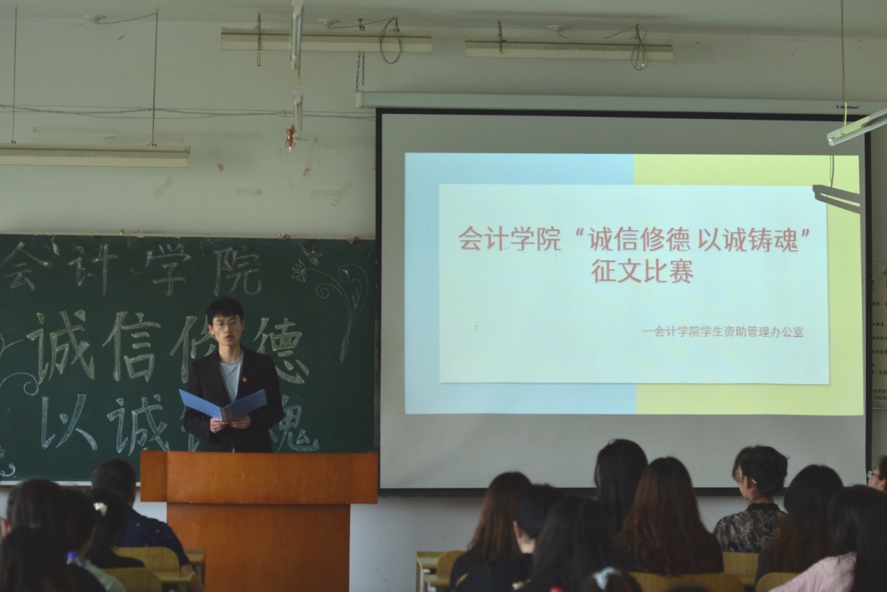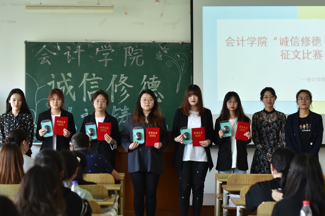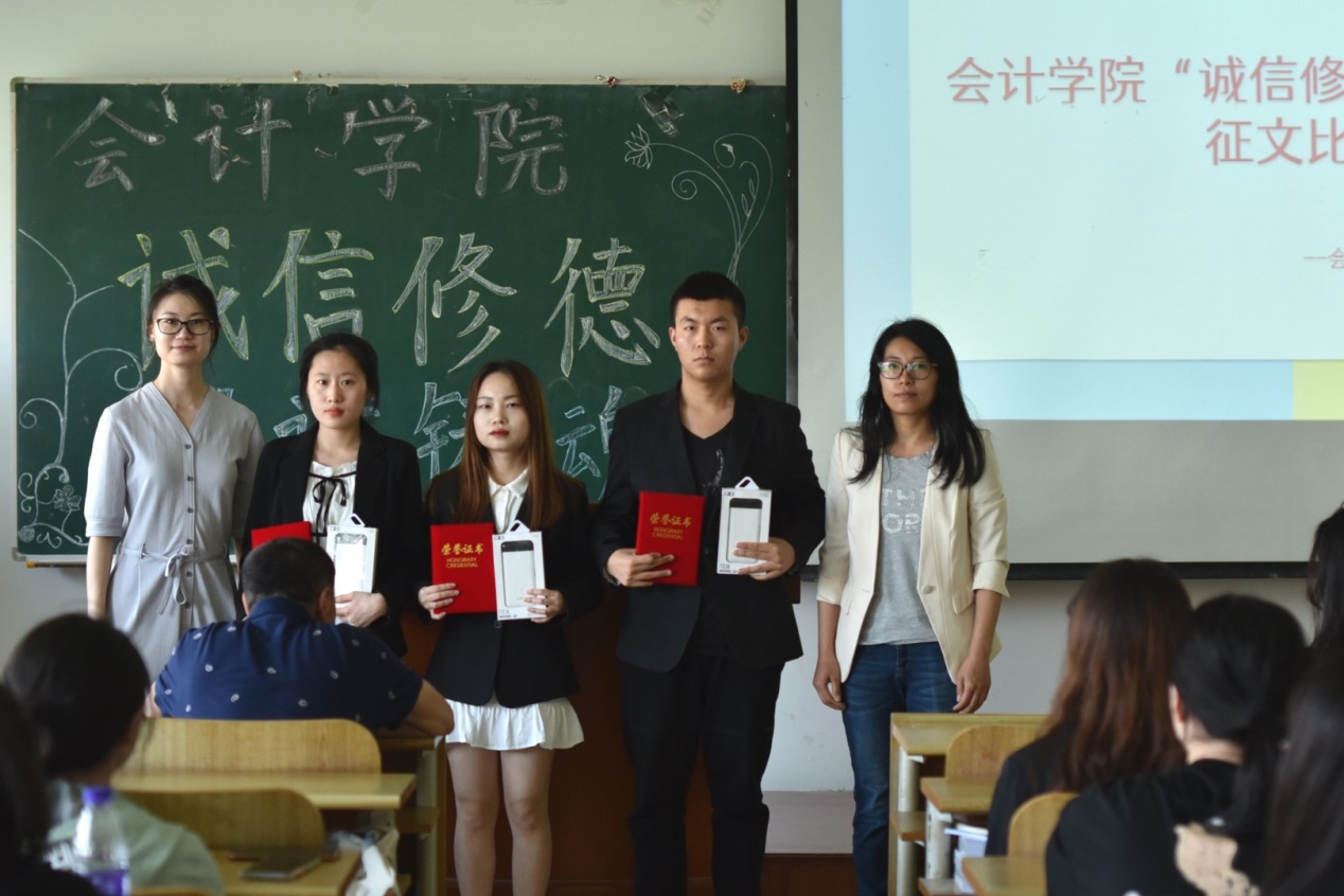 为响应我校学生资助诚信教育的号召,促使大学生树立诚信光荣的道德观念,会计学院开展了“诚信修德 以诚铸魂”为主题的征文比赛,征文比赛从初选到最终评选,为期半个月时间,同学们积极参与,加强了我院学风和院风管理。2021年6月9日,会计学院党委书记张春明,团委书记白璐,2018级辅导员陆黎敏,2020级辅导员张涵,姜译涵,研究生辅导员李修茹以及全体参赛同学参加了征文颁奖仪式。