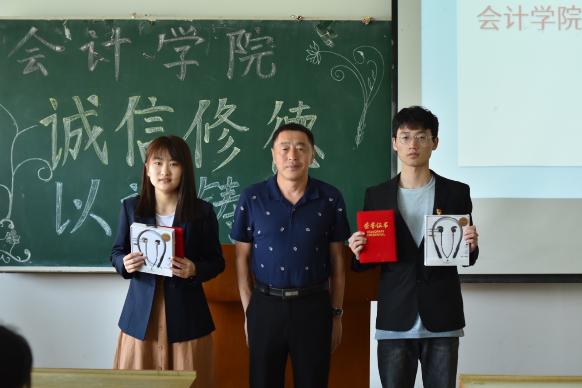 张春明书记在颁奖仪式上讲话,充分肯定了本次征文比赛的意义,表示诚信是做人的灵魂,是会计学子最重要的品质,同时勉励会计学子一定要牢铸诚信文化,练就诚信品质,发扬诚信优良作风。一等奖获奖同学陈润泽作为学生代表发言,对所有给予他帮助的老师和同学表达最真诚的感谢,同时表示自己一定会脚踏实地,刻苦学习,在以后的学习生活中自觉践行诚实守信,慎独前行。随后学院老师为获奖同学颁奖,并合影留念。