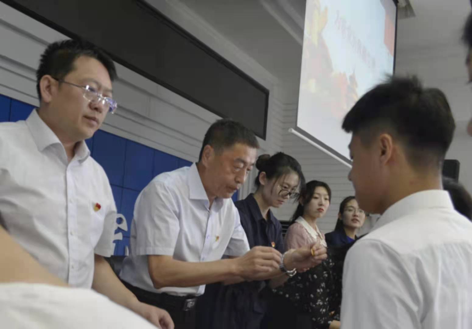 “戴党徽 亮身份”环节,老师们为毕业生新党员代表佩戴党徽,激励学生党员强化党性观念和党员意识,时刻牢记自己是一名光荣的共产党员。学院送给《毕业生党员一封信》,组织员奚迪向毕业生党员转达了学校对毕业生党员的寄语,并对党组织关系转接相关事宜进行了说明。