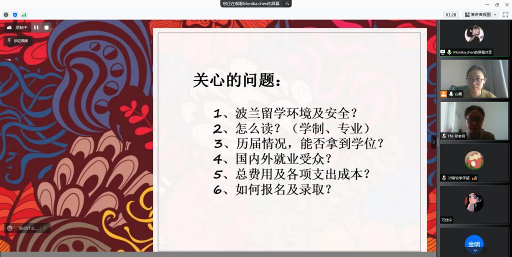 会上,副院长徐鹿老师首先介绍了此次主讲嘉宾哥白尼大学中国代表处的陈芳老师以及哥白尼大学基本情况。哥白尼大学作为波兰非常知名的综合类大学,不仅在医学、天文等方面有突出的成绩,在商科方面也是波兰众多公立高校中第一个获得AACSB认证的商学院。其次,团委书记白璐老师介绍了自2018年两校建立合作以来历届学生参加项目的情况,最后由哥白尼大学中国代表处的陈老师向同学介绍了项目上大家关心和感兴趣的“哥白尼大学3+1+2”商科本硕连读的相关情况。