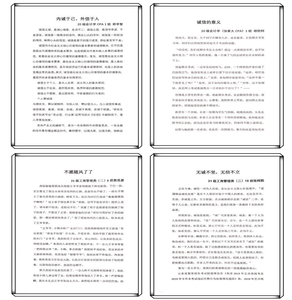 诚信是中华民族的传统美德,是当今社会需要大力弘扬的道德规范。为提倡当代大学生树立正确的价值观,加强诚信意识,弘扬诚信精神,提升我院学生以诚待人,以信立业的文化素养,会计学院举办了“践行诚信 筑梦远航”主题征文活动。