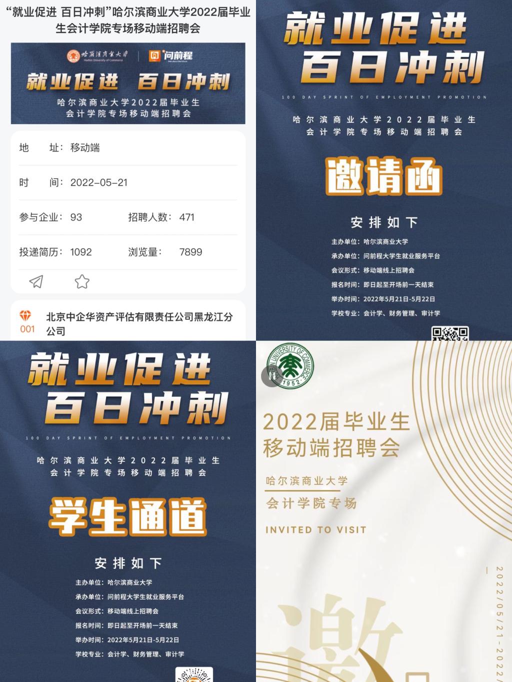 为进一步做好2022届毕业生就业工作,深度开展校企合作,5月21日、22日,会计学院通过“问前程”大学生就业服务平台,举办了“哈尔滨商业大学2022届毕业生会计学院专场移动端招聘会“。