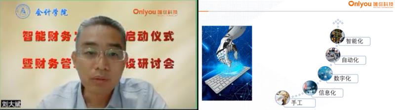唯你科技产教融合项目负责人刘大斌先生介绍了“智能财务发展中心”项目,指出项目主题是“智能化财经人才培养的路径”,此次成立的“智能财务发展中心”是未来进行智能化财经人才培养的一个重要模式。目前在很多的央企、国企以及其他企业中都开始使用智能化软件系统,如何根据实践领域的智能财务实施情况在高校中培养企业需要的财务管理人才是一个重要问题,基于本次合作项目召开的此次会议,就是想同财务管理人才培养单位,也就是各个高校一起探讨如何搭建和应用好“智能财务发展中心”平台,培养更多符合企业现实需求的数字化、智能化财务管理人才。