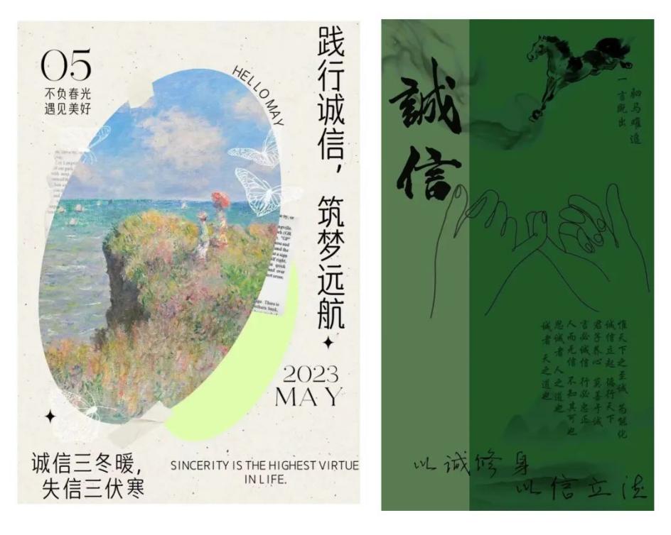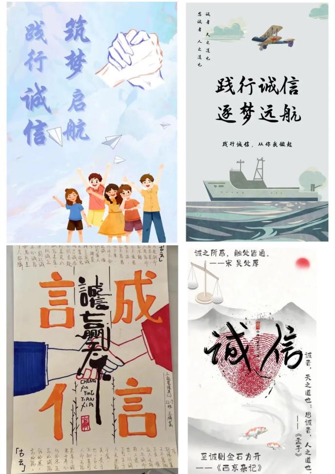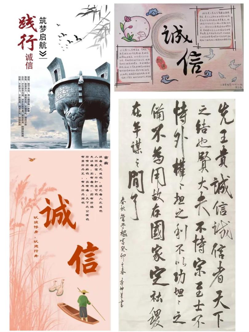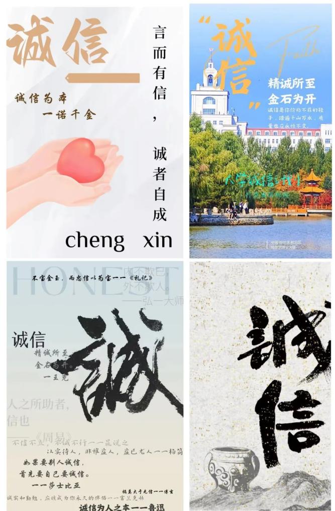 活动期间,同学们积极参与,他们用自己的创意和才华,设计出了一幅幅富有内涵和美感的艺术作品,或用书法、绘画等形式展现诚信的精神。这些作品不仅展现了同学们的艺术水平和审美情趣,也体现了同学们对诚信的认同和践行。秉承着公平公正公开的原则,此次活动通过公众号线上投票评审,最终评选出一等奖2名,二等奖4名,三等奖8名。