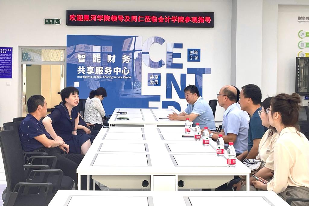 张劲松院长对黑河学院经济管理学院各位领导及同仁的到来表示热烈欢迎,带领参观智能财务共享服务中心,介绍学院在数智时代下的发展特色、改革创新与实践成效,并着重指出智能会计的发展核心依旧在于“会计”,数字化、智能化是技术赋能,传统会计向智能会计发展变革的过程中,必须建设匹配的硬件环境和软件平台、培养复合型师资、融合创新课程体系。黑河学院经济管理学院孙磊书记介绍了经济管理学院会计系的招生、就业以及师资建设等具体情况,就会计学院生源与就业情况等问题与学院领导进行了沟通。