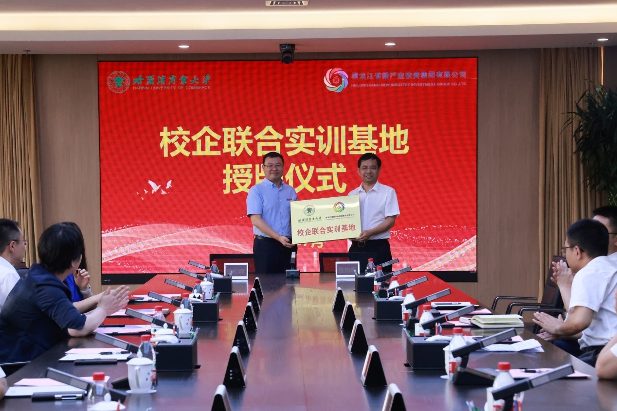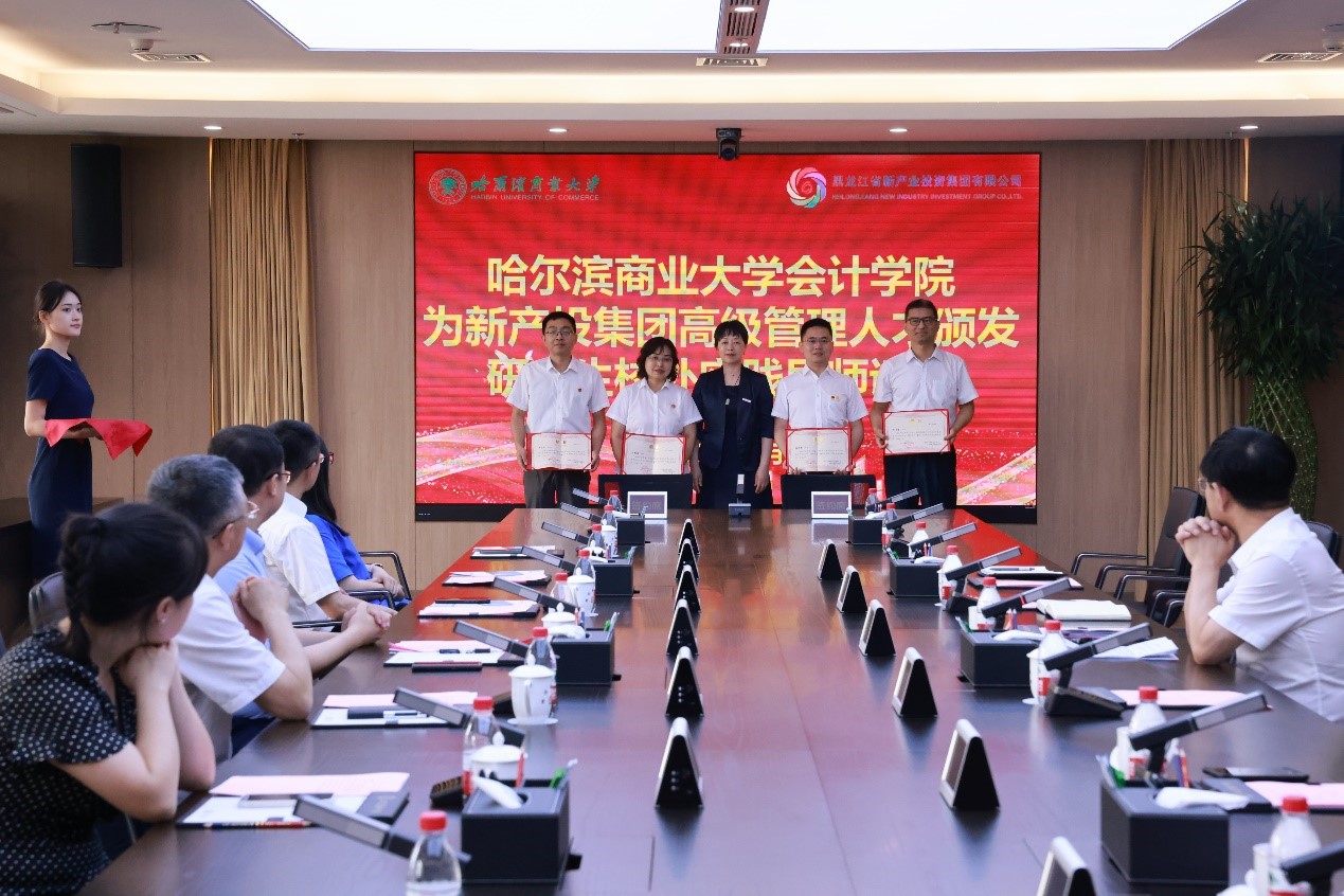 座谈开始前,双方共同观看了会计学院宣传片、黑龙江省红色会计宣传片,副校长赵大伟与新产投集团党委副书记高尚国共同为校企联合实训基地授牌。会计学院张劲松院长与新产投集团党委委员、总会计师张艳梅同志分别代表哈尔滨商业大学会计学院与黑龙江省新产业投资集团财务部签订校企实习就业基地合作协议书,并为新产投集团张艳梅、武宝忠、滕延冬、周鲁宝等4名同志颁发研究生校外实践导师证书。