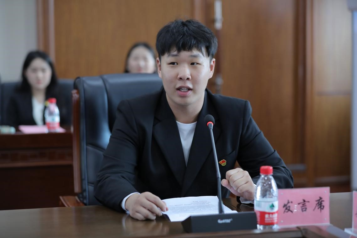 实习生2022级审计专硕研究生卢佳楠作为学生代表进行发言,对建投集团以及学校、学院给大家提供的机会表示感谢,并就本次实习做出积极表态,保证在实习期间严格遵守工作纪律、保守商业秘密,争取能够在实习期间获得建投集团的认可,通过招聘留在集团工作,为龙江经济发展做出自己应有的贡献。