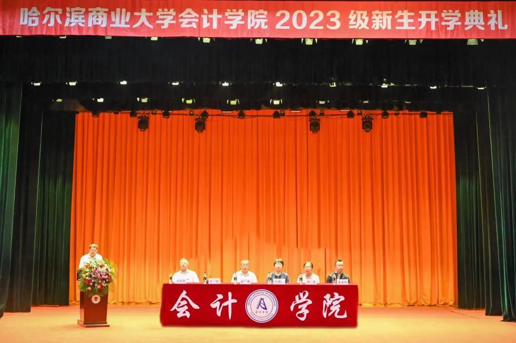 8月30日17:00,哈尔滨商业大学会计学院2023级新生开学典礼在B区大礼堂顺利举行。会计学院党委书记张春明、院长张劲松、党委副书记王博、副院长徐鹿、副院长梁运吉、副院长姜雪松出席典礼。学院教师代表、全体辅导员老师、2023级本、硕、博605名新生参加典礼。典礼由院党委副书记王博主持。