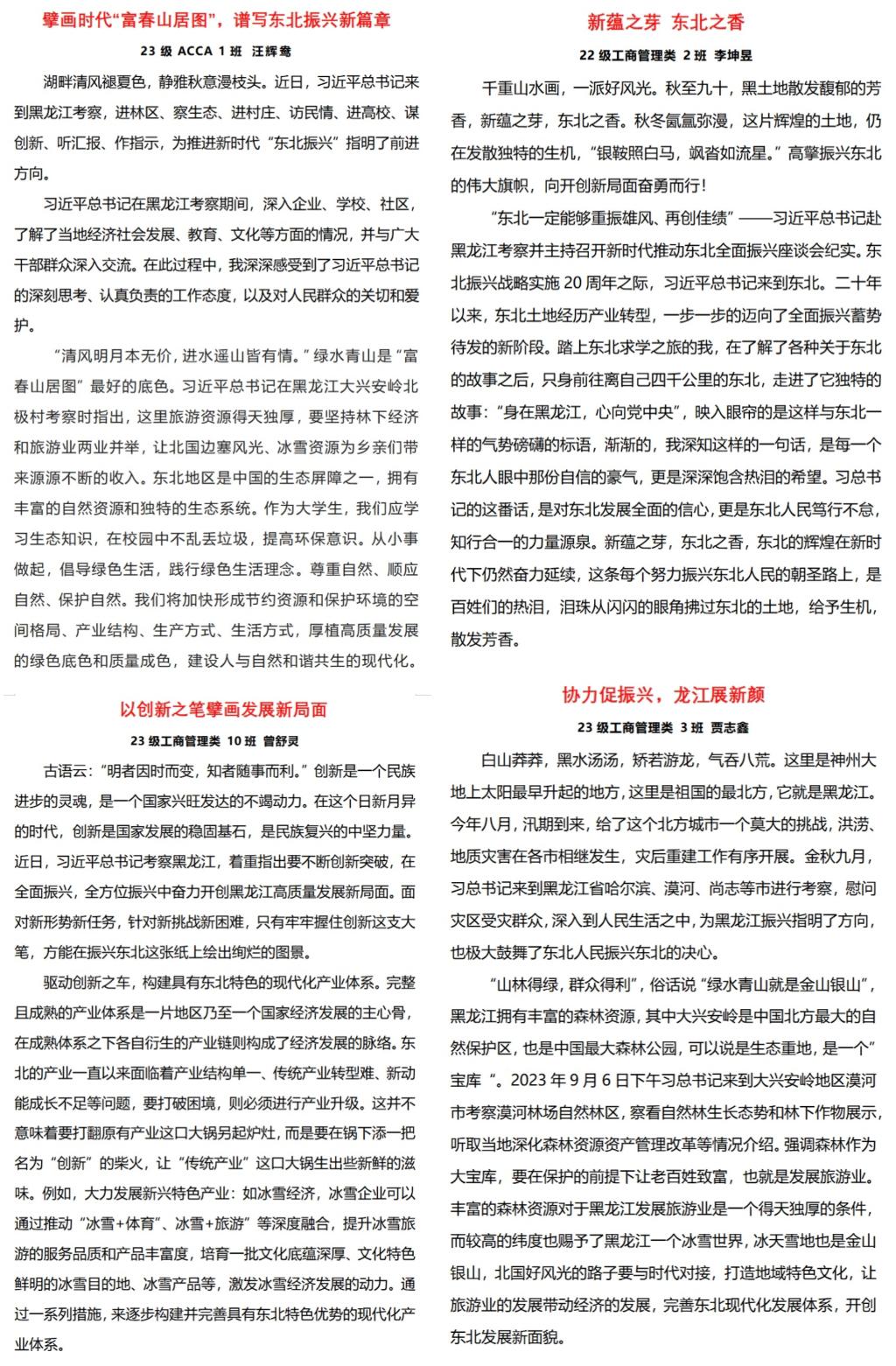 为深入学习贯彻习近平总书记在黑龙江考察和主持召开新时代推动东北全面振兴座谈会时的重要讲话重要指示精神,引领广大学生牢记时代责任,会计学院以“聚焦全面振兴,勇担时代使命”为主题开展征文活动。