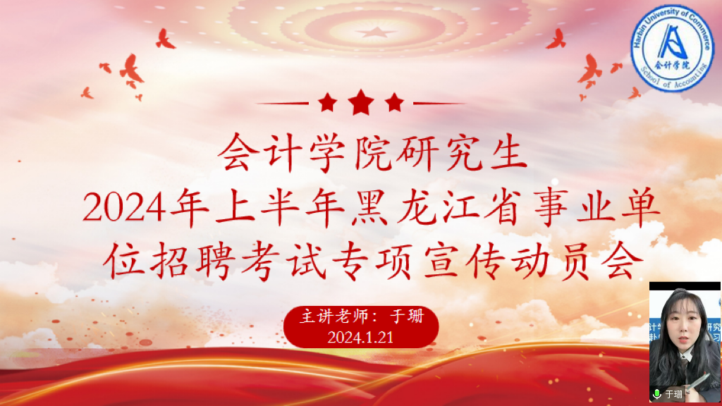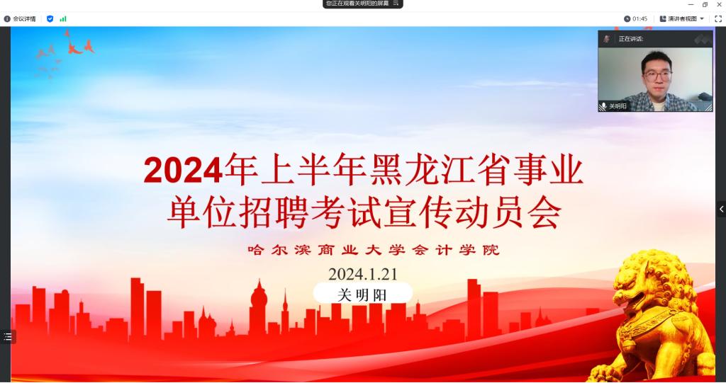 近日,2024年上半年黑龙江省各地事业单位公开招聘工作人员公告发布。为提升毕业生就业能力,实现毕业生更高质量、更充分就业,助力毕业生顺利开启职场大门,会计学院研究生、本科生毕业年级辅导员通过线上会议召开了“会计学院毕业年级事业单位报考宣传动员大会”。