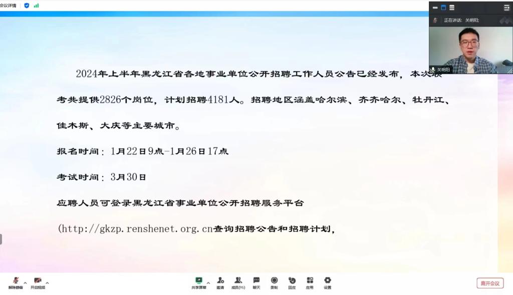 会上,本科毕业年级辅导员张涵老师首先对2024年上半年黑龙江省事业单位招聘考试的形势进行了初步介绍,详细讲述了本次事业单位招聘考试的具体报名流程,便于同学们了解和参与考试。
