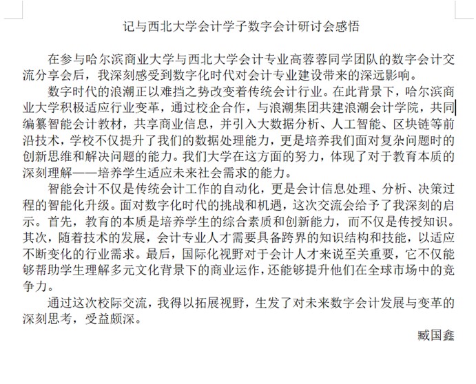 在拥抱数字时代浪潮,共筑智能会计未来的道路上,本次数字会计人才培养交流研讨会为我们提供了宝贵的机遇和启示。通过与西北大学的深入交流与探讨,我们更加坚信在数字化转型的道路上,产教融合、校企合作以及培养复合型、应用型人才等举措将引领我们走向成功。期待在未来的合作中,我们能够携手助力智能会计领域的发展,共同开创数字时代下智能会计未来的辉煌。