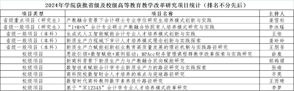 按照《黑龙江省教育厅关于组织开展2024年度高等教育教学改革研究项目立项工作的通知》要求,由“学院初审-学校复审-专家评审”三级评审方式,会计学院获批“2024年度省高等教育教学改革研究推荐项目”5项,其中重点项目(研究生)1项,一般项目(研究生)1项,一般项目(本科)3项。获批“2024年度校级高等教育教学改革研究立项项目”6项。与往年相比,省级重点项目、一般项目和校级项目的获批项目数量稳步提升。