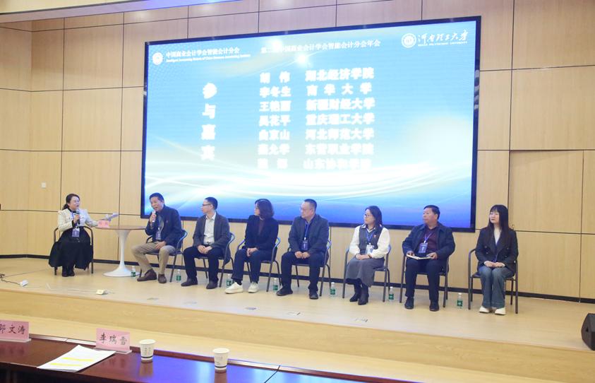 论坛以“智能会计时代会计人才培养”为主题,邀请湖北经济学院会计学院院长胡伟教授、南华大学经济管理与法学学院副院长李冬生教授、新疆财经大学会计学院副院长王艳丽教授、河北师范大学会计系主任曲京山教授、重庆理工大学吴花平教授、东营职业学院会计学院党总支副书记燕允学教授、山东协和学院会计学院副院长魏娜教授等7名专家参与讨论。刘阳教授凭借其专业的学术背景和出色的主持能力,成功引导了论坛的讨论,保持论坛氛围活跃,确保了对话的深入与高效。