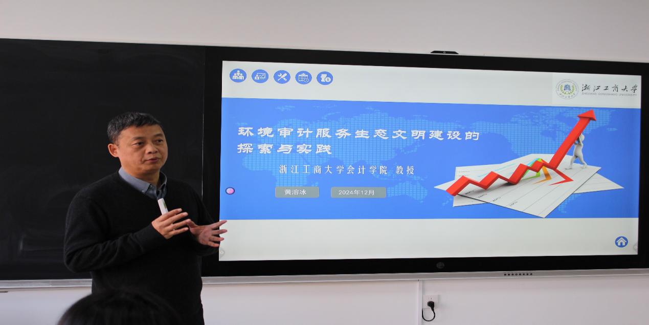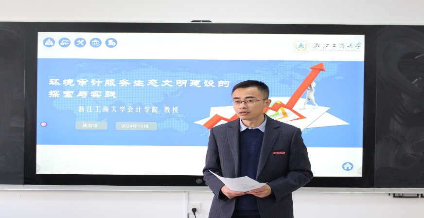 开拓学术视野,增强学院师生对学术前沿的关注度12月20日,浙江工商大学会计学院审计研究中心主任黄溶冰教授应邀莅临会计学院,为审计教研室全体教师和2024级研究生做《环境审计服务生态文明建设的探索与创新》讲座。会计学院副院长姜雪松教授主持本次讲座。