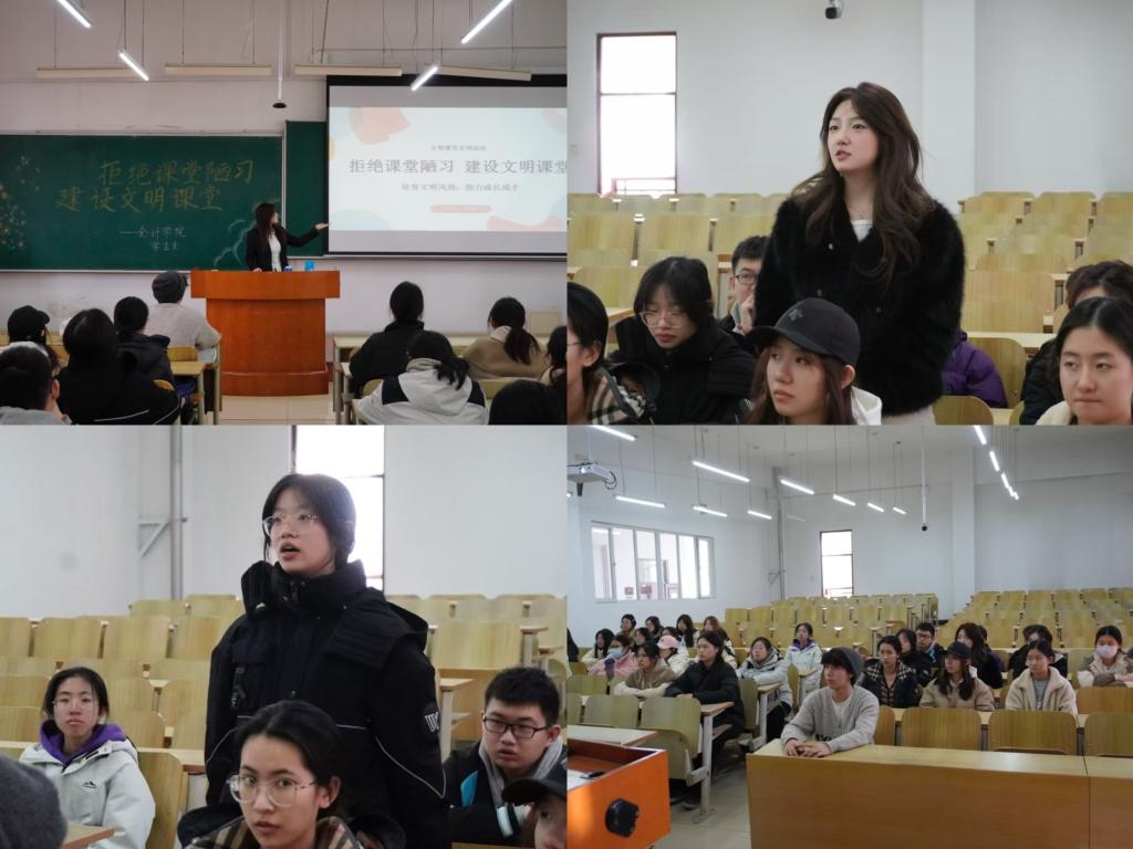 3月21日,会计学院组织开展了“培育文明风尚助力成长成才”主题讲座。通过展示课堂上不文明行为的具体表现和产生危害,从而提出切实可行的解决办法。这不仅有助于学生形成对课堂陋习清晰的认知和摒弃的决心,更有效地推动了文明学风建设与有序课堂的打造,营造了积极向上的课堂氛围。