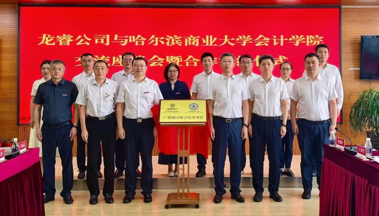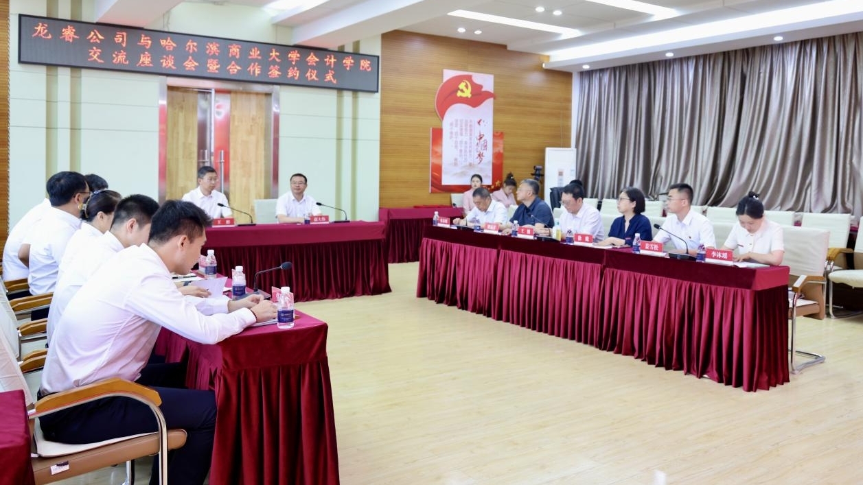 7月24日,在学校党委常委、副校长赵大伟的带领下,会计学院一行到访黑龙江省龙睿资产经营有限公司进行交流座谈、授牌产教融合联合培养单位并签署战略合作协议。本次交流旨在人才培育、学术探索、产学研转化等领域充分发挥各自独特优势,整合资源,积极创新,深度拓展合作模式,为培养地方经济发展需要的会计人才贡献力量。参加交流的双方人员有哈尔滨商业大学党委常委、副校长赵大伟,会计学院党委书记张春明、院长梁运吉、副书记王博、副院长徐鹿、副院长姜雪松、研管办副主任李沐瑶;龙睿公司党委书记、董事长王彬,党委委员、总会计师刘跃刚,财务中心负责人张强、副经理张凯坤,外贸集团党委委员、总会计师巩立新和泽生物公司总会计师李东颖,龙睿数科公司总会计师王承智。