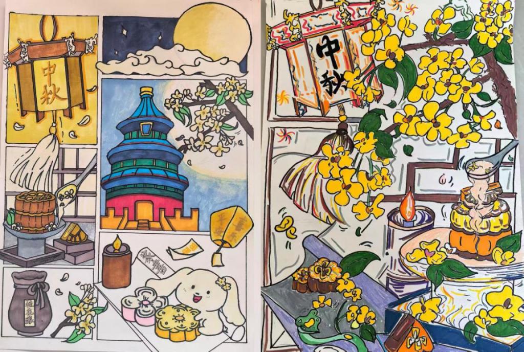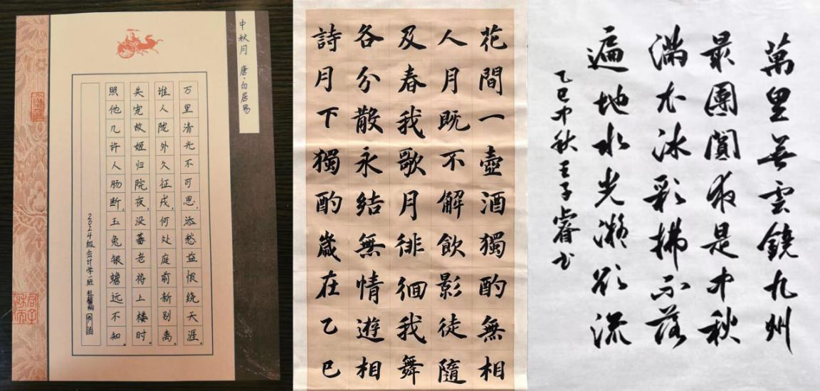 “书画之间显才情”活动中,学生们以笔为媒、以纸为卷将皎皎明月、灵动玉兔、馨香桂树凝于尺幅之间,书法作品尽显汉字风骨与中秋意蕴。中秋的温情诗意和传统文化的深厚底蕴在笔墨丹青中静静流淌,浸润人心。