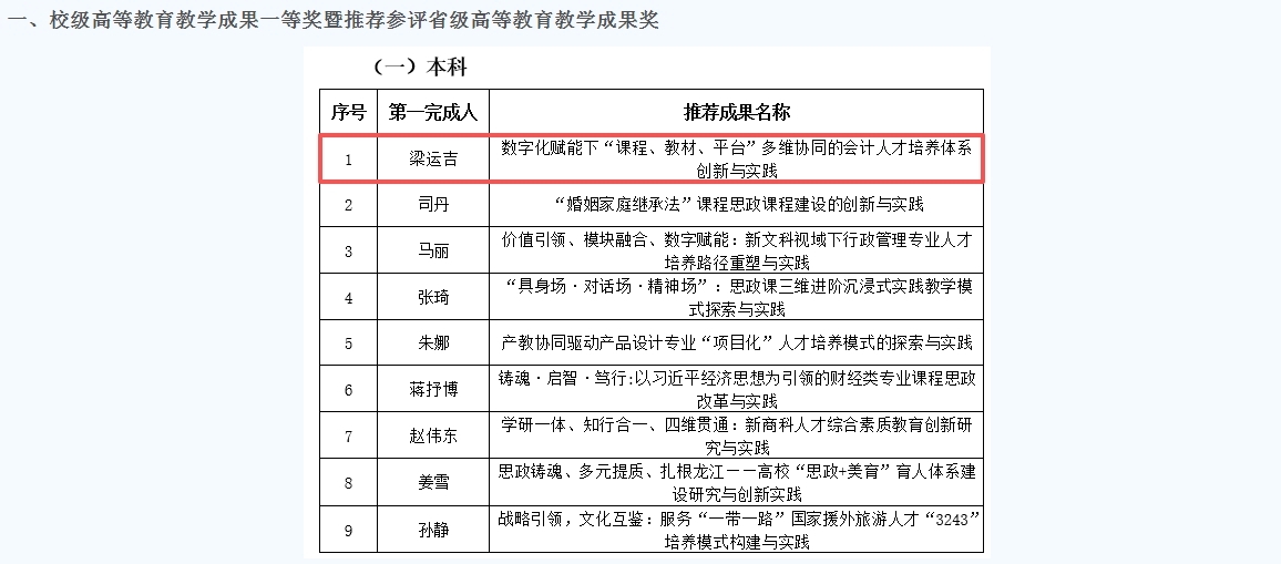 学院高度重视教学成果奖申报,积极组织院内遴选与专家辅导,有针对性地的优化项目细节,为成果培育与高质量申报提供了有力支撑。获奖成果聚焦财会专业教育改革前沿与复合型人才培养,涵盖课程思政建设、数智化教学平台、教材体系创新等关键领域,充分彰显了学院在教研融合与模式探索方面的前瞻视野与实践成效。