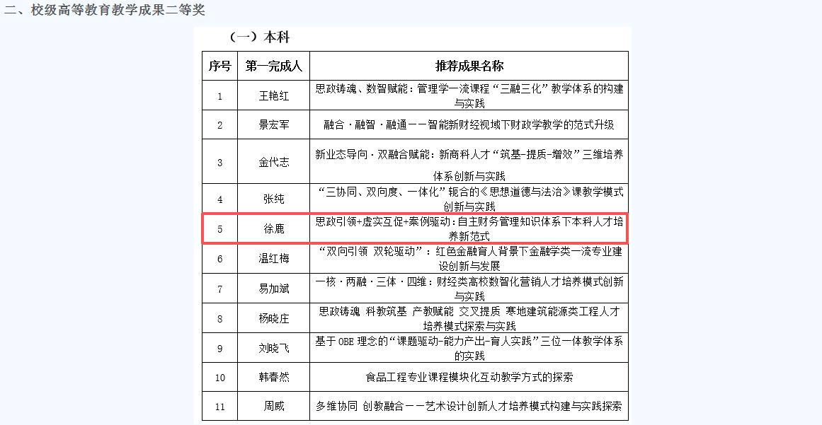11月3日,在学校公布的2025年度校级教学成果奖获奖名单中,评选出校级高等教育(本科)教学成果奖一等奖9项、二等奖11项,我院梁运吉教授获得校级教学成果一等奖并推荐参评省级、徐鹿教授获得校级教学成果二等奖。