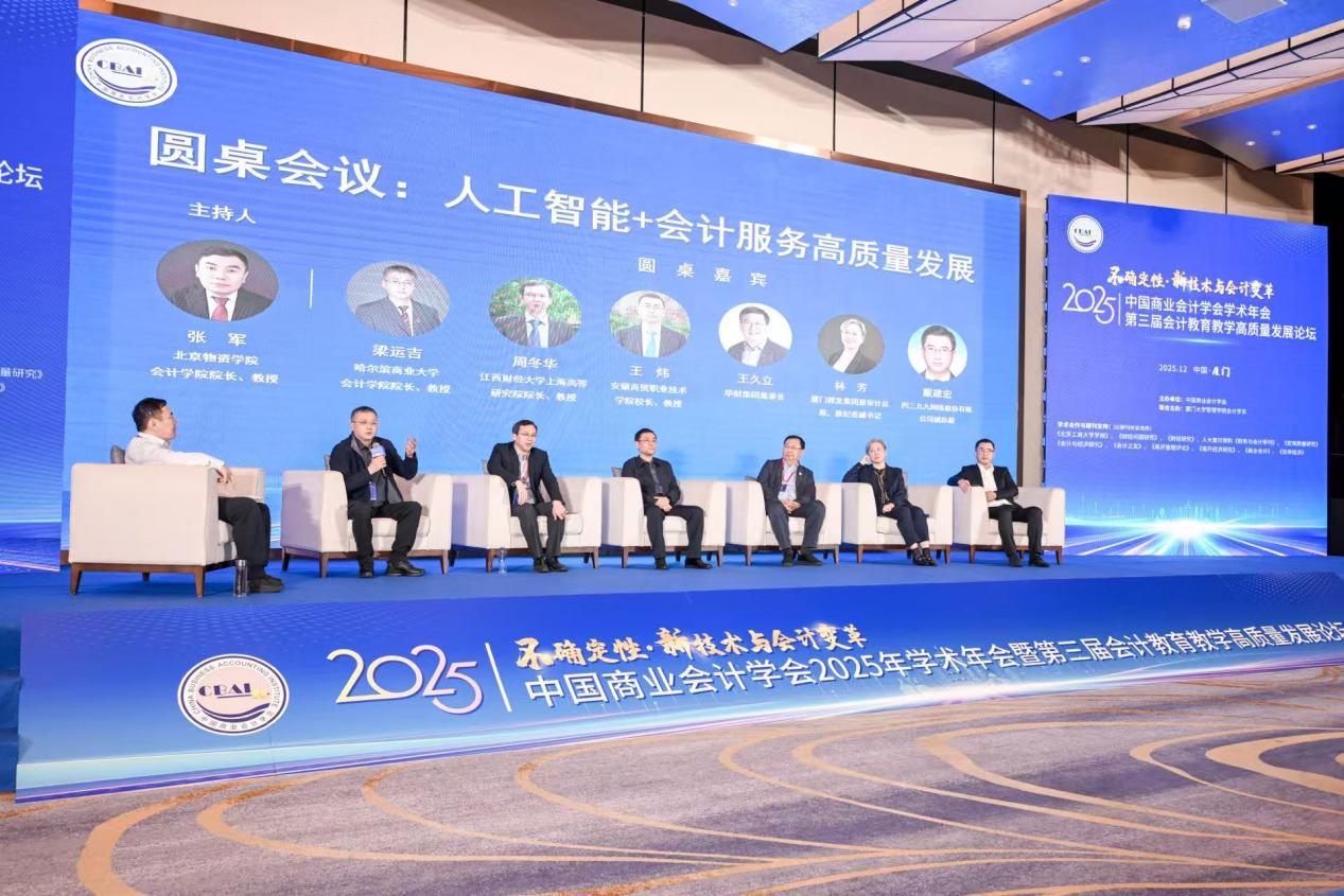 会议通过圆桌论坛方式,讨论了人工智能+会计服务高质量发展的话题,圆桌论坛由北京物资学院会计学院院长张军教授主持,哈尔滨商业大学会计学院梁运吉教授、江西财经大学上海高等研究院院长周冬华教授、安徽商贸职业技术学院校长王炜教授、华财集团王久立董事长、厦门建发集团原审计总监林芳女士、四三九九网络股份有限公司副总裁戴建宏先生分别分享了AI在辅助高校教育教学、改变会计岗位能力需求、改革会计专业人才培养模式、服务财务会计活动、服务审计活动、服务业财融合发展等方面的经验。