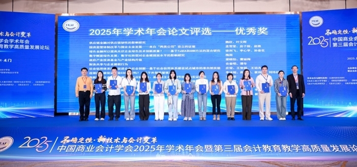 12月7日上午是第二场大会主题报告,报告主题围绕“企业数字化部署与数据成本战略”“科学智能与会计研究”“数字时代:教学与教材的困境与未来”依次展开。主题报告后,会议对会计专业数字化规划教材和2025年学术年会优秀论文进行了表彰,我院李沐瑶副教授的会议投稿论文“连锁股东能促进企业ESG履行吗?基于外部监督视角”荣获本届学术年会优秀论文“三等”奖。