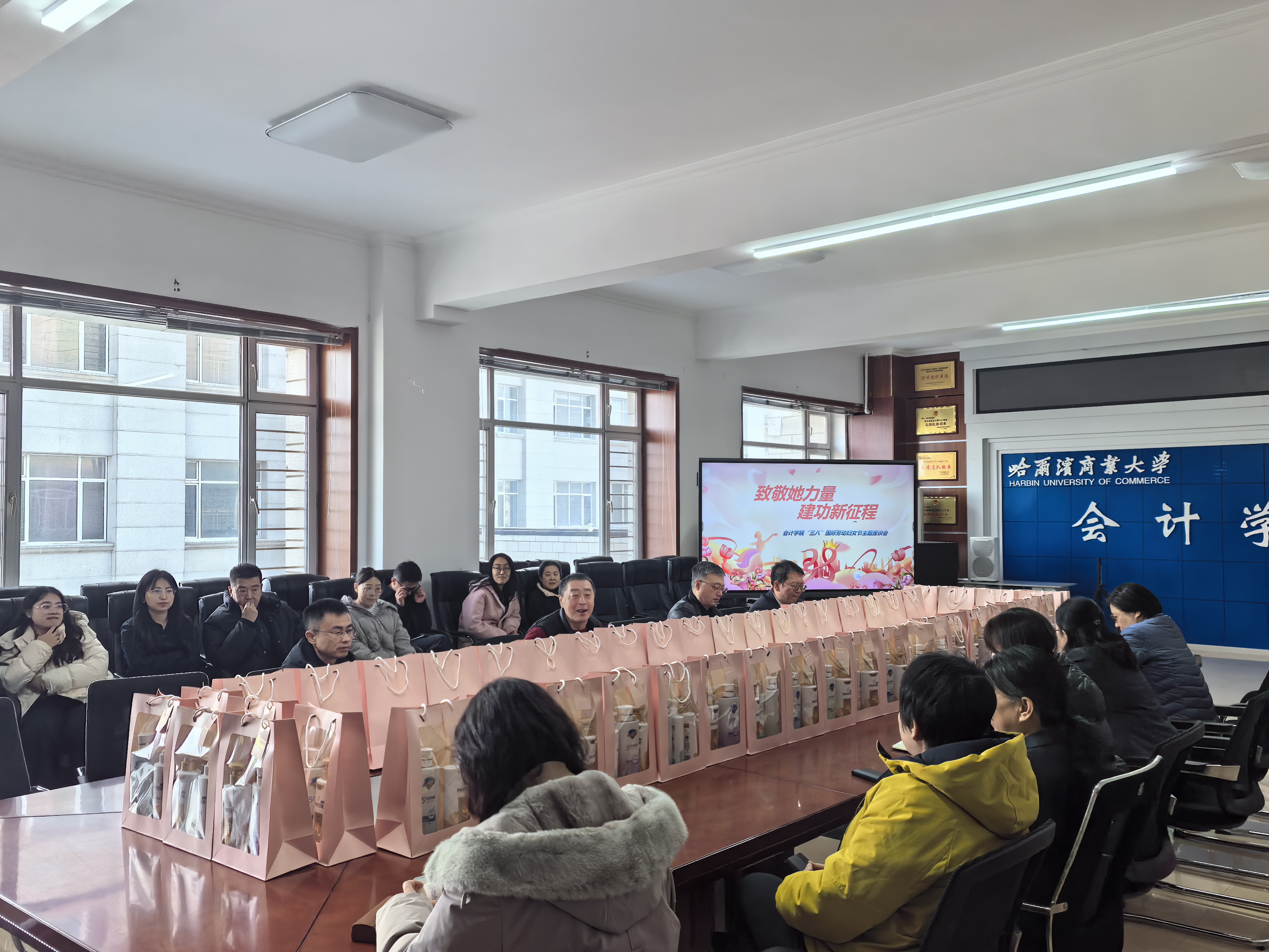 阳春三月,芳华绽放。为庆祝第116个“三八”国际劳动妇女节,2026年3月4日,会计学院在1405会议室展开妇女节专题座谈会,向全院女教职工送上节日的祝福与关怀。院党委书记张春明、院长梁运吉及学院领导班子成员出席活动。