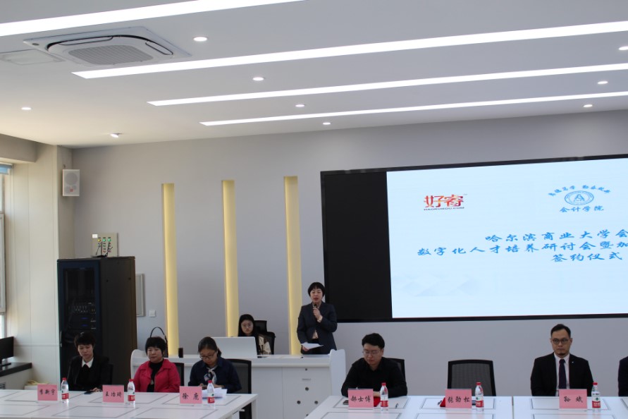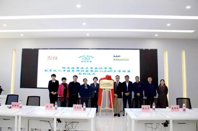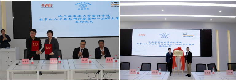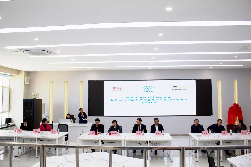 随着数字中国建设的深入发展,数字技术得到广泛应用,为会计行业带来了机遇与挑战,数字化人才培养模式对会计、财务管理专业人才培养和创新具有十分重要的意义。为顺应时代发展,培养数字化专门人才,5月10日上午,会计学院在智能财务共享中心(4306)举办了数字化人才培养研讨会——暨加入SAP大学联盟签约仪式。来自会计学院的领导和老师、SAP大学联盟资深项目经理、北京交通大学SAP大学研究中心总监,好睿教育科技总经理、东北农业大学、黑龙江大学、东北石油大学、齐齐哈尔大学、广厦学院等兄弟院校领导和专家,以及会计学院2021级学硕、2022级全体硕士研究生共同见证了签约仪式。本次签约仪式由副院长徐鹿主持。