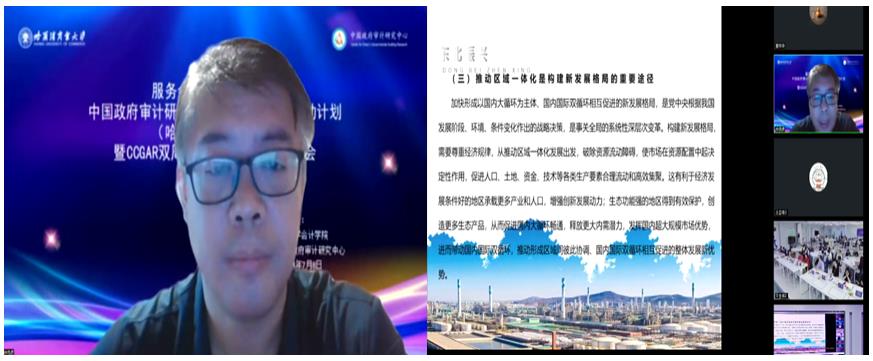 哈尔滨商业大学副校长赵大伟教授出席了此次会议。参会特邀嘉宾有兰州大学杨肃昌教授、黑龙江省社会科学院孙浩进所长、东北林业大学曹玉昆教授、南京审计大学廖林副教授、哈尔滨工程大学陈恒教授、西南财经大学中国政府审计研究中心主任蔡春教授、副主任余海宗教授、副主任蔡利教授、哈尔滨商业大学会计学院院长张劲松教授、副院长梁运吉教授、副院长徐鹿教授、副院长姜雪松副教授、审计教研室主任姜玲玲教授、副主任王宇慧副教授,同时来自全国高校的专家学者、老师和同学们、以及哈尔滨商业大学会计学院全体在读研究生以线上和线下结合的方式参加本次学术研讨会。